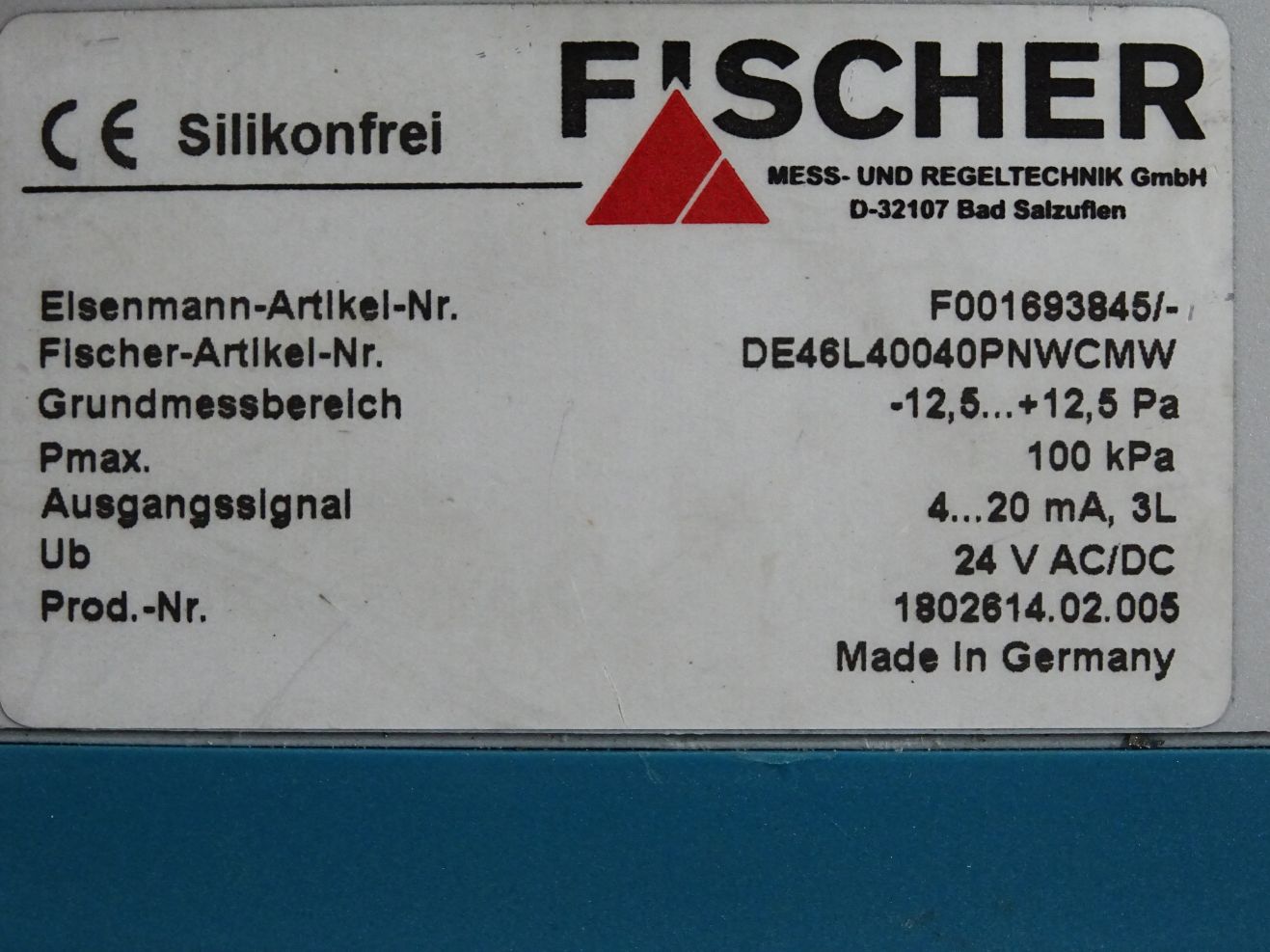 Fischer Differenzdruckschalter DE46L40040PNWCMW -12.5..+12.5Pa / Neuwertig