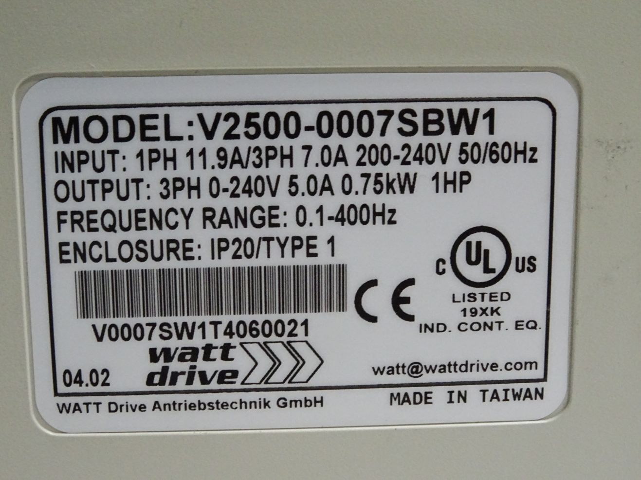Watt Drive V2500 OPTI-Line V2500-0007SBW1 0.75kW Frequenzumrichter / Neuwertig