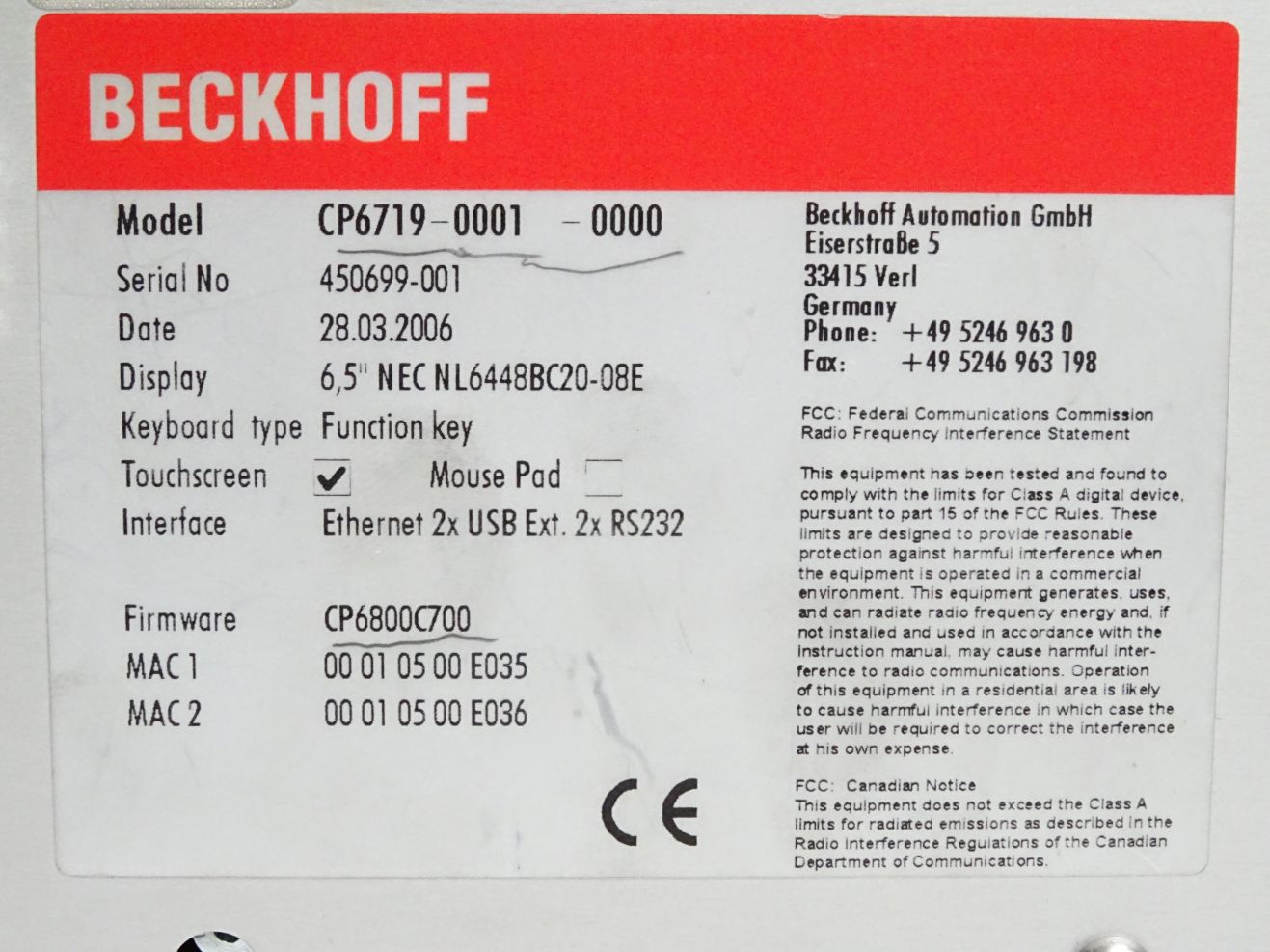Beckhoff CP6719-0001-0000 Einbau-Control-Panel 6.5" Touchscreen