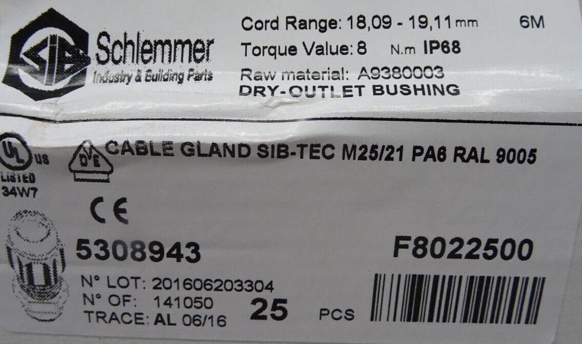 Schlemmer 5308943 Kabelverschraubung M25/21 / D 9,0-18 mm / Inhalt : 11 Stück / Neu OVP