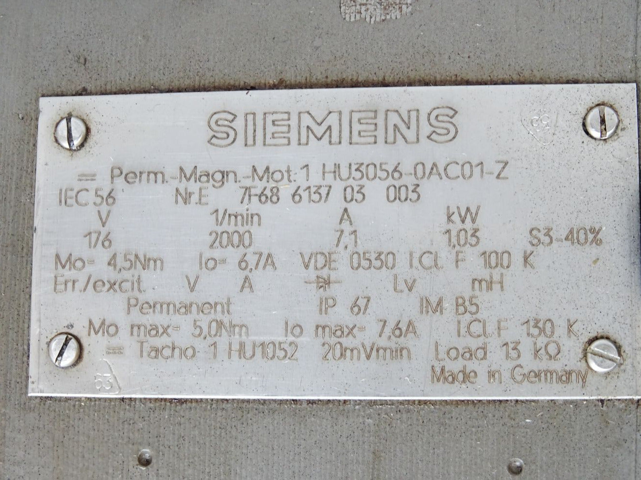 Siemens Permanent Magnet Motor Servomotor 1HU3056-0AC01-Z 2000min-1 1.03kW