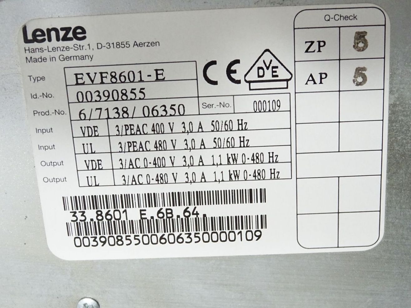Lenze 8600 Frequenzumrichter EVF8601-E 33.8601 E.6B.64 003908551.1kW