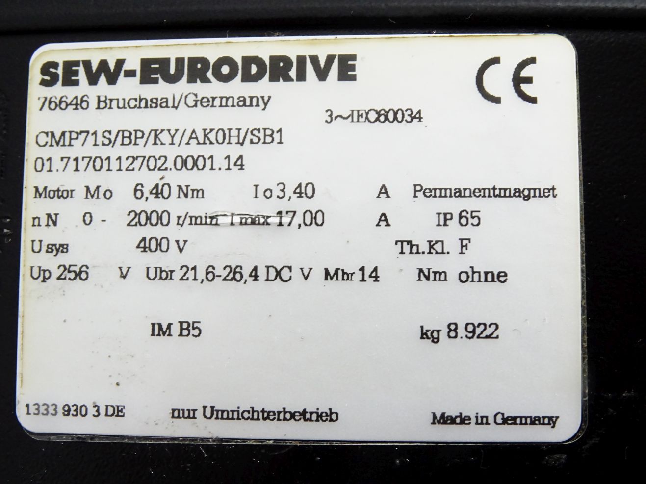 SEW Eurodrive Servomotor CMP71S/BP/kY/AK0H/SB1 2000r/min / Erneuert