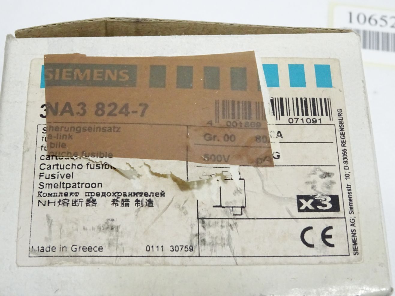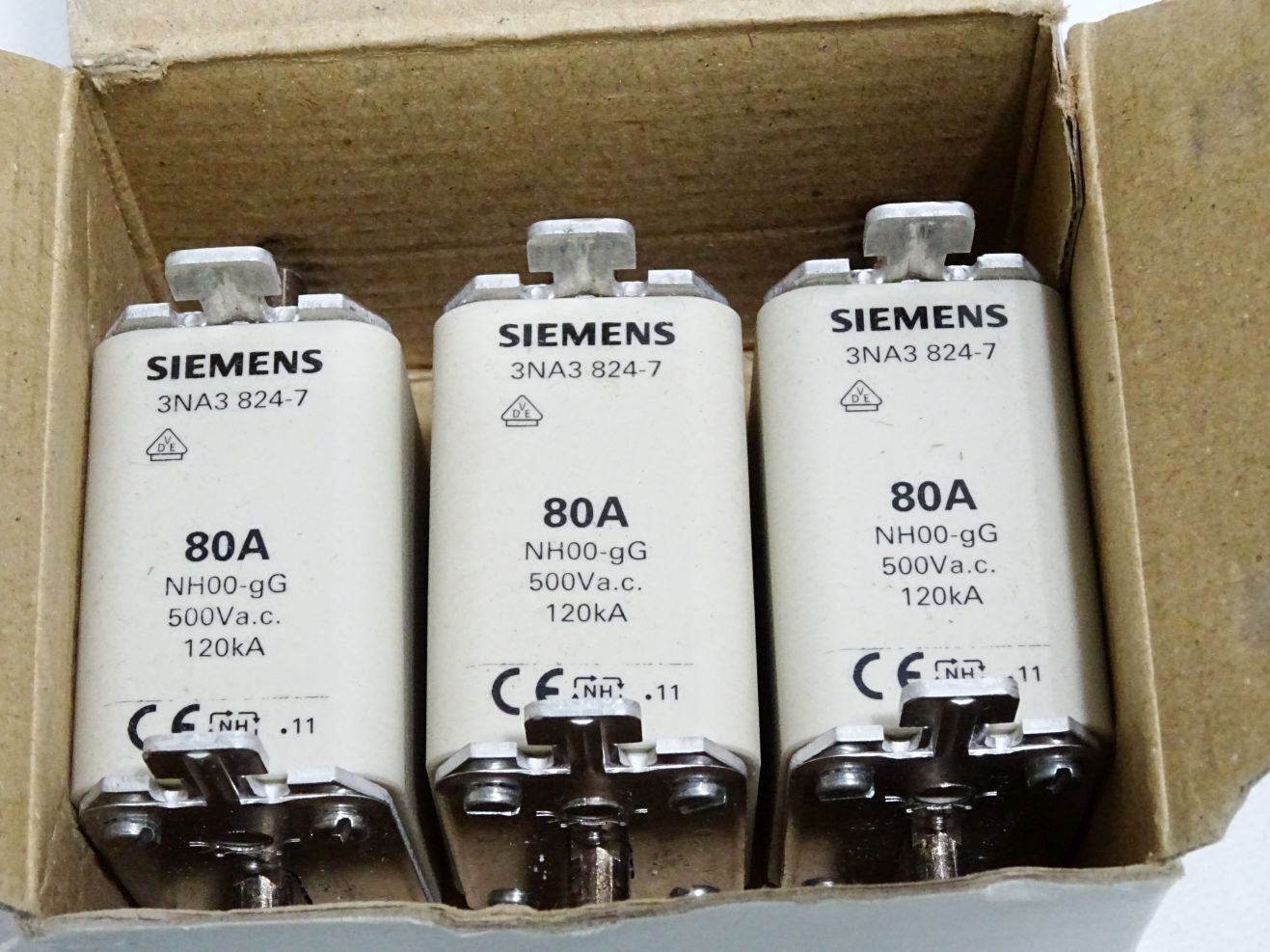 Siemens Sicherungseinsatz 3NA3824-7 NH00 80A 500VAC / Inhalt : 3 Stück / Neu OVP