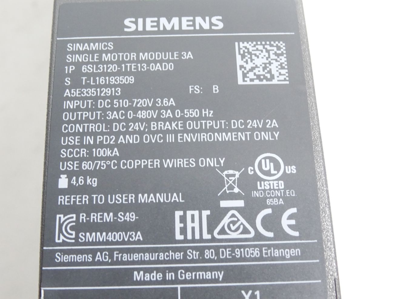 Siemens Sinamics Single Motor Module 3A 6SL3120-1TE13-0AD0