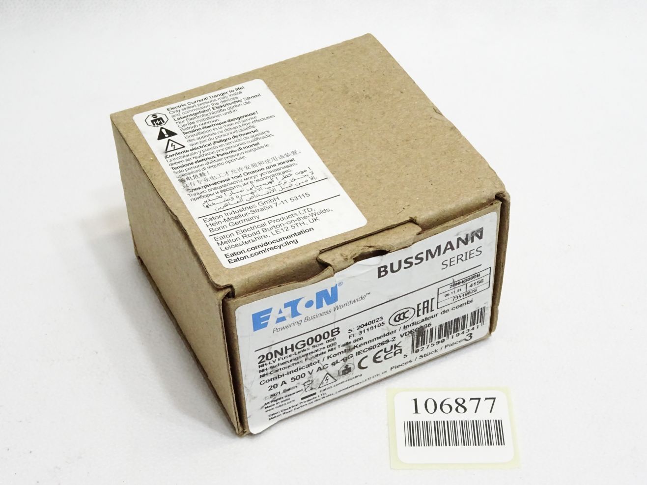 Eaton Bussmann 20NHG000B NH-Sicherungseinsätze 20A 500VAC gL/gG / inhalt:3 Stück / Neu OVP