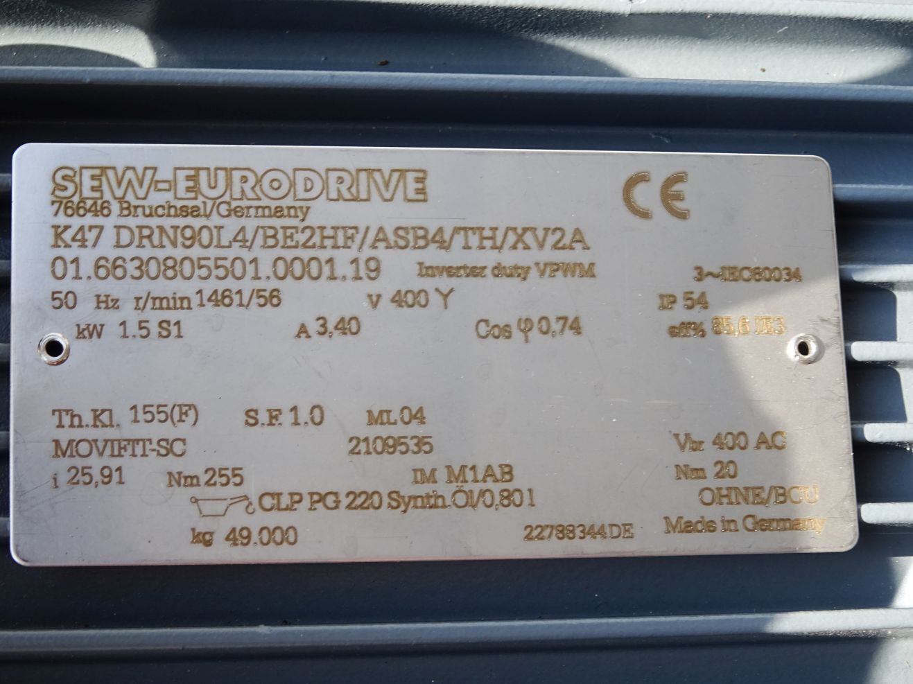 SEW Eurodrive Getriebemotor K47 DRN90L4/BE2HF/ASB4/TH/XV2A 01.6630805501.0001.19 r/min1461/56 1.5kW i25,91 / Neu mit Lagerspuren