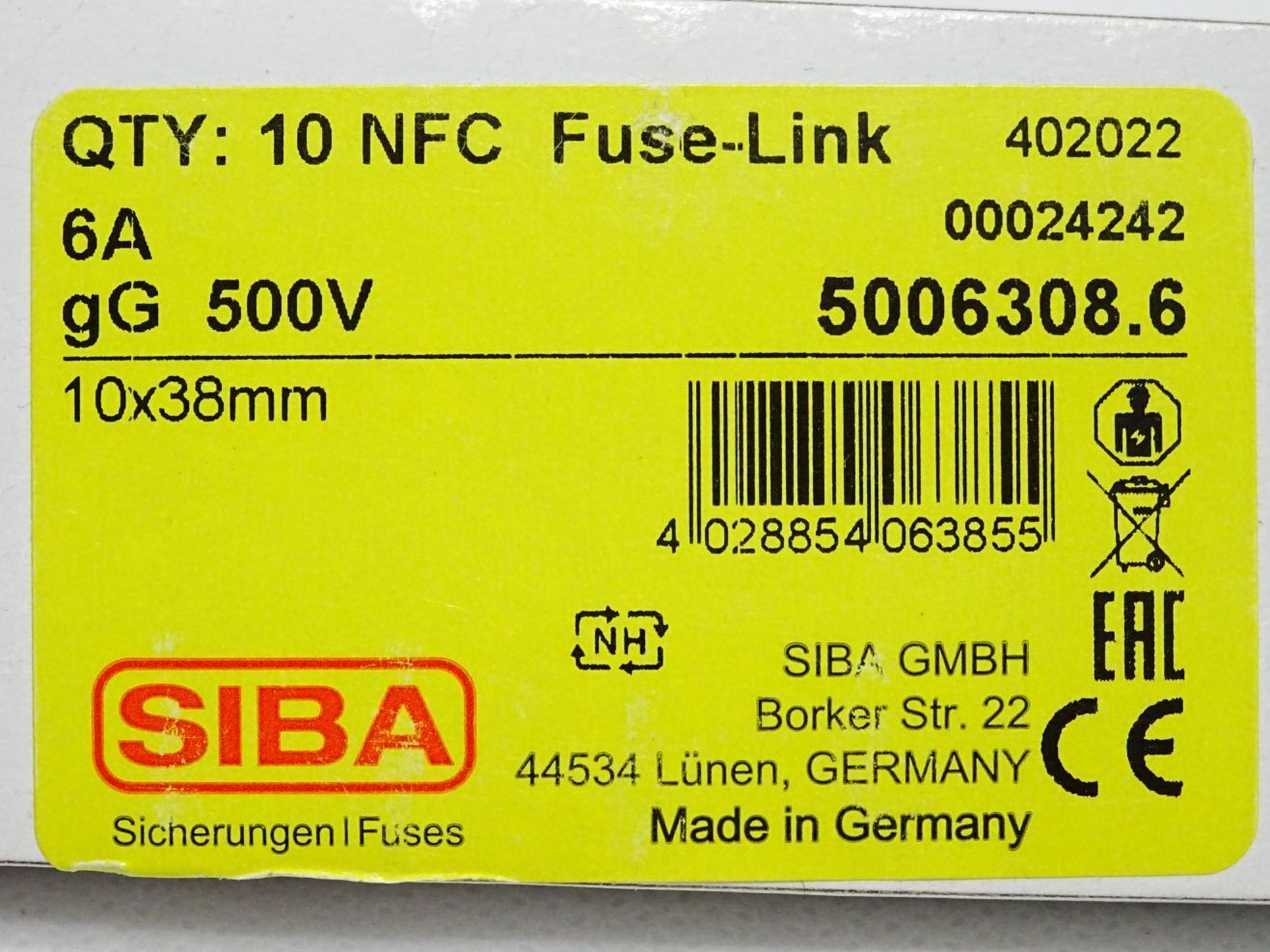 SIBA Sicherungen 5006308.6 / Inhalt : 10 Stück / NFC Fuse Link 6A gG 500V / Neu OVP