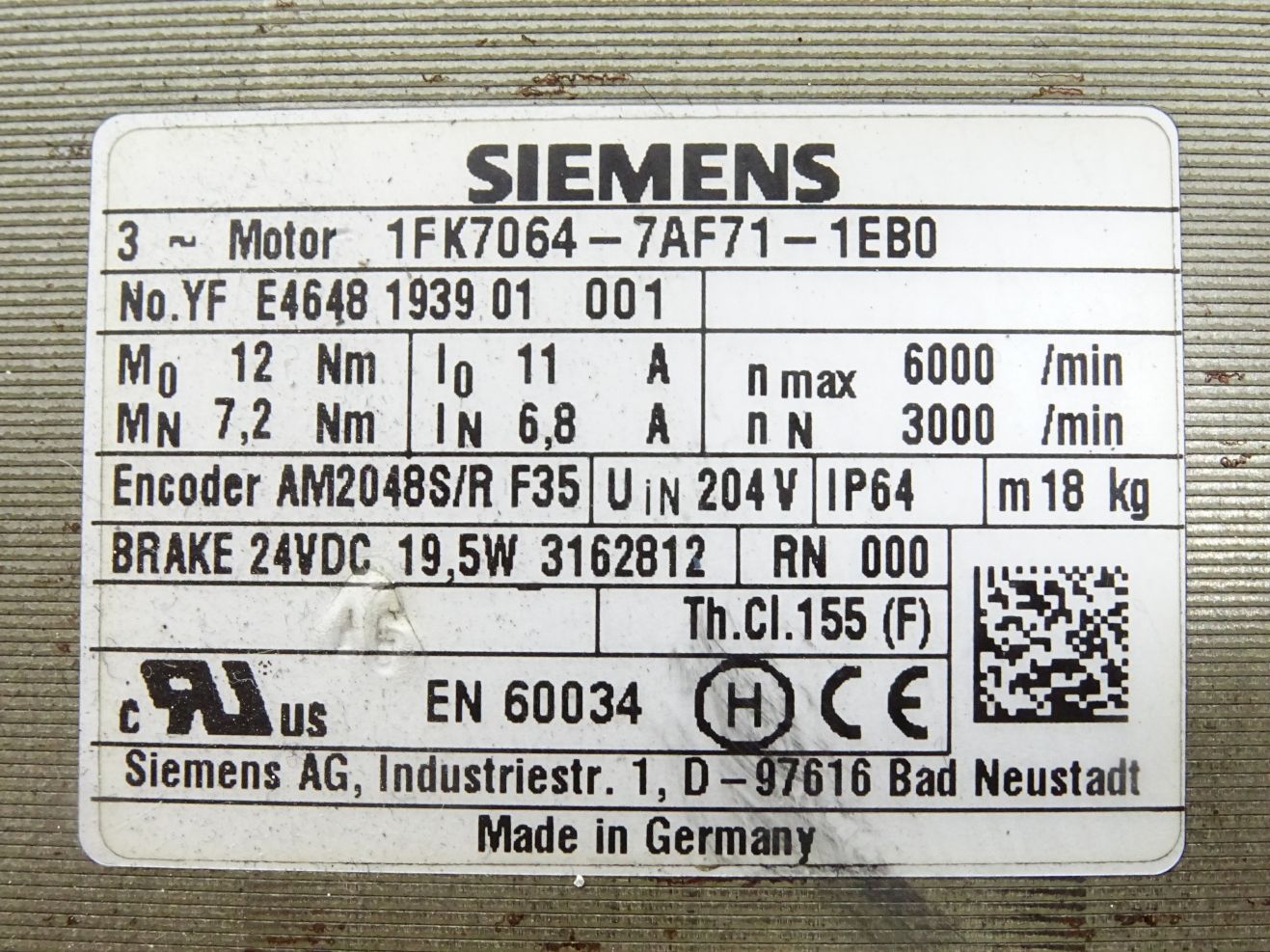 Siemens Servomotor 1FK7064-7AF71-1EB0 3000min-1