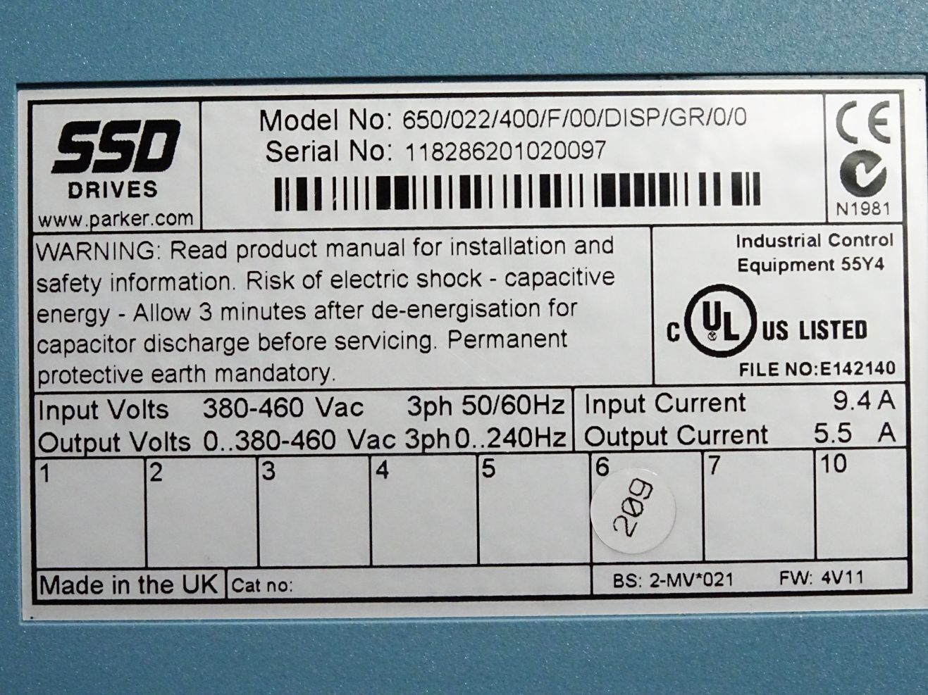 Parker SSD Drives 650 series 650/022/400/F/00/DISP/GR/0/0