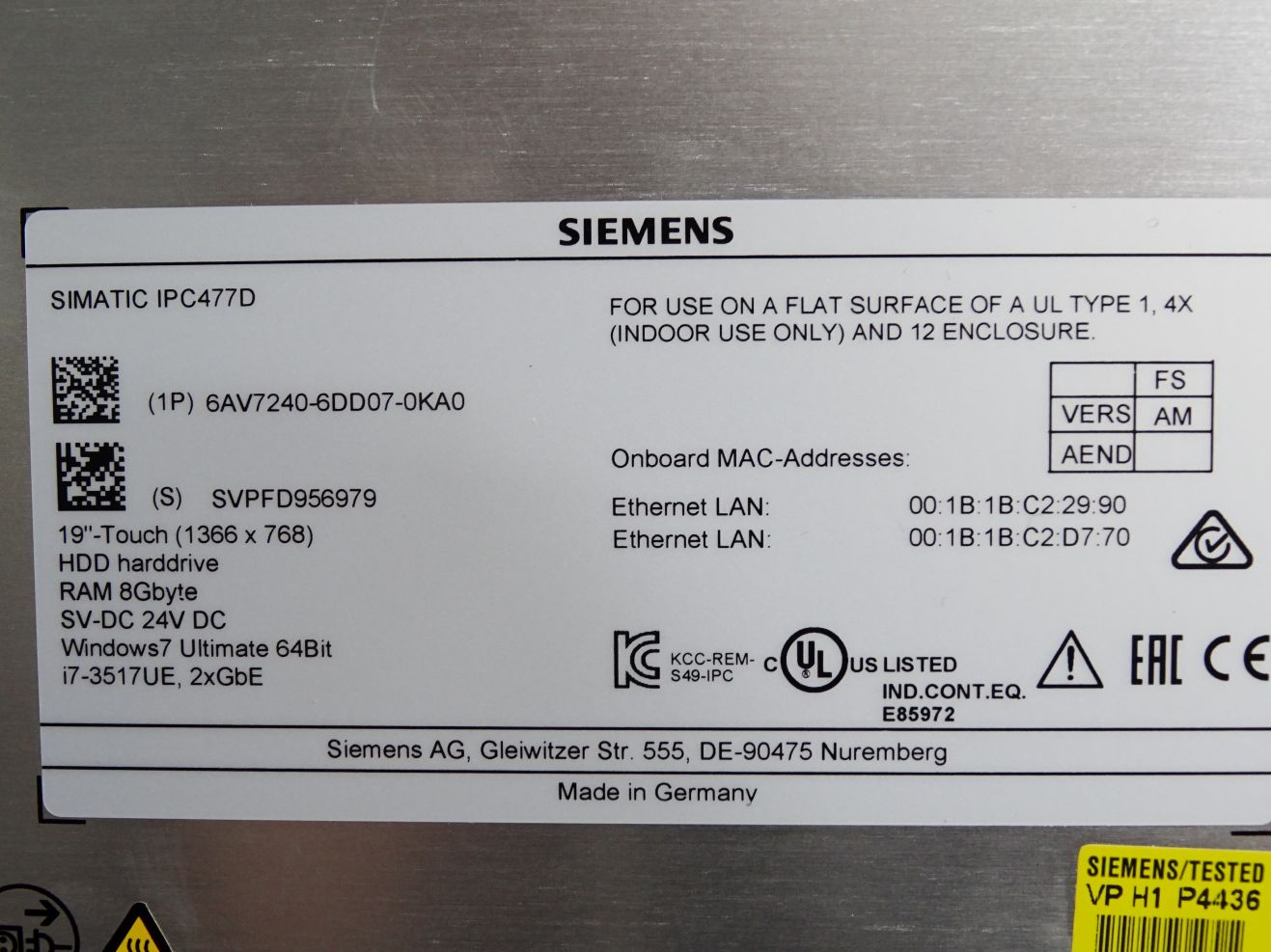 Siemens Panel IPC477D 6AV7240-6DD07-0KA0 19" 8GB RAM i7-3517UE 2xGbE