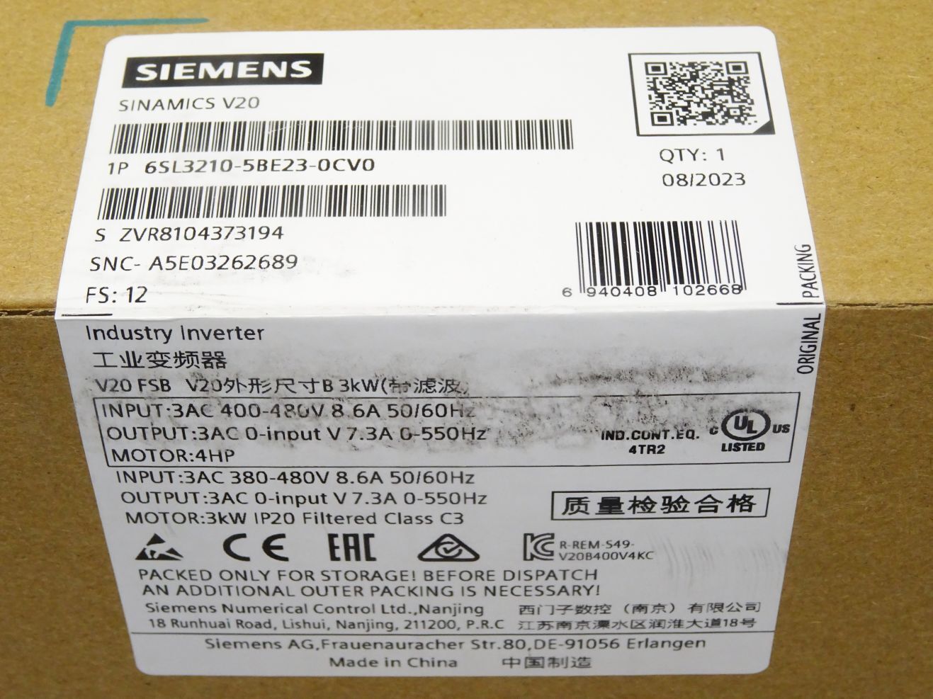 Siemens Sinamics V20 6SL3210-5BE23-0CV0 6SL3 210-5BE23-0CV0 / Neu OVP versiegelt